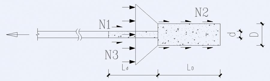 通常の引張型アンカーは、まずグラウトのアンカー端をセメントモルタルで固定し、アンカーの引張力をアンカー周囲の把持力によってセメントモルタルに伝達します。その後、セメントモルタルの定着と接地層間の摩擦力を介して、安定した地盤層の補強ゾーンに力が伝達されます。引張力は、前から後ろに向かって徐々に定着土に伝達されます。ロッドに沿うせん断応力は、その集中応力による不均一な分布を持っています。