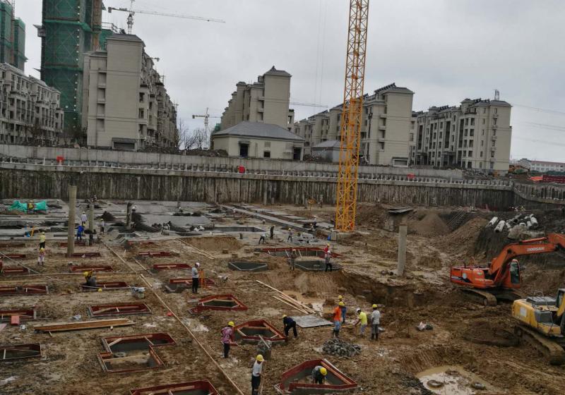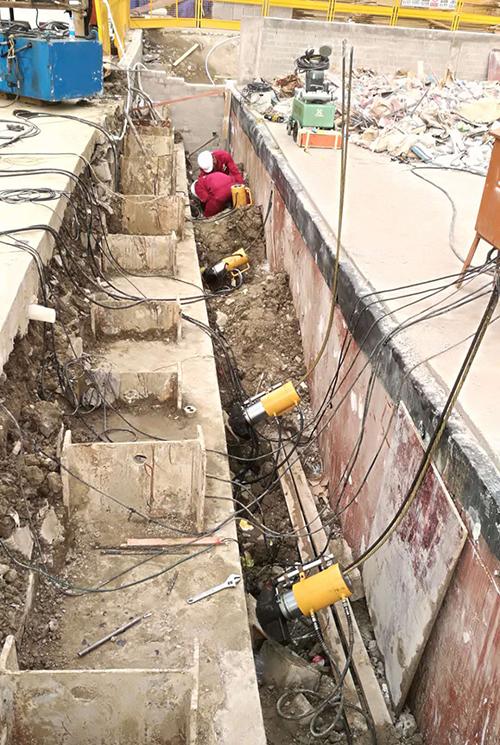 基礎ピットの西側と北側の境界線外側に高い杭があり、東側に高いバックフィルがあります。掘削の深さやプロジェクトのさまざまな地層は、圧縮応力分散型低圧回転スプレーとホットメルト除去アンカー技術のSMW(土壌混合壁)施工方法を、ブレース計画として使用しています。掘削の深さは7.2mで南側の境界に近いので、杭打ち方式としてカンチレバー工法で実施します。一方、土台ピットは、圧縮応力分散型のアンダーロータリスプレーとホットメルト除去アンカーブレーススキームと一緒に、SMW工法を用います。リムーバブルアンカーは、ホットメルト除去技術と一体化された圧縮応力分散型アンダーライトロータリースプレーを使用し、ジェットグラウトは特定の回転速度およびドリル深度制御を実装します。このように、アンカーの分散は最小限に抑えられ、回収率は97.6%に達しました。最終的に、掘削後の移動は管理下にあり、その結果は我々の期待通りでした。